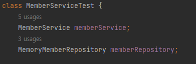 MemeberServiceTest 클래스에서는 MemberSerivce, MemberRepository 변수를 선언한 후에,