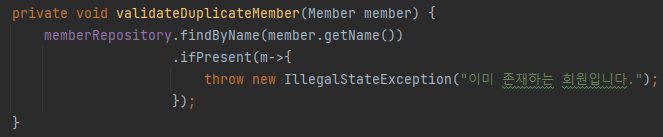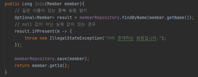 이때 같은 이름을 가지는 중복 회원은 가입되지 못하도록 하기 위해, memberRepository에 member 객체의 이름을 가진 회원이 있는지 확인을 하는 코드를 작성해보자.