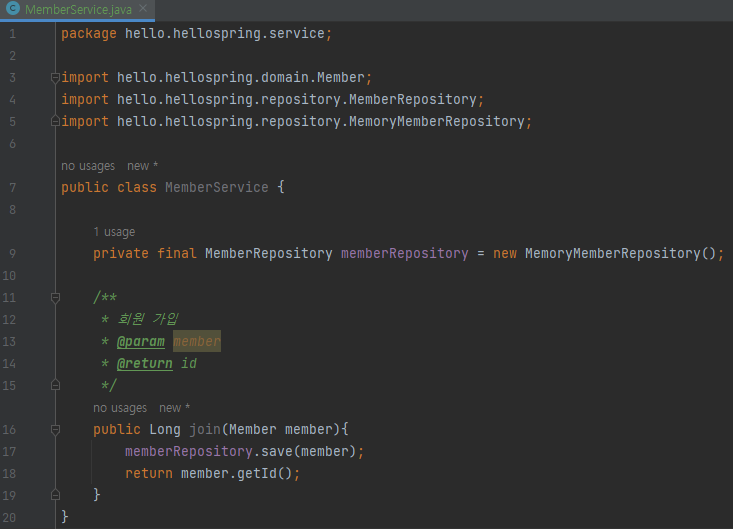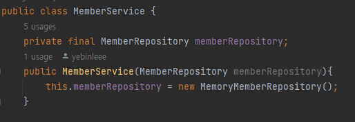 우선 MemberService 에서 하나의 메모리를 이용하도록 private final 형으로 MemeberRepository 변수를 선언하고,