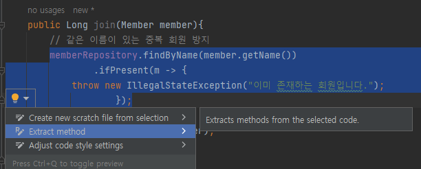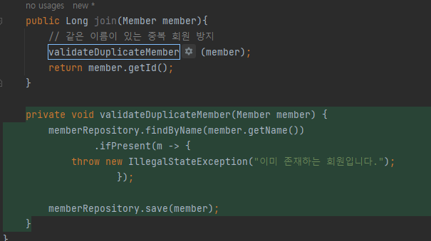 다음과 같이 ValidateDuplicateMember() 라는 이름의 새로운 메서드로 따로 분리하였다.