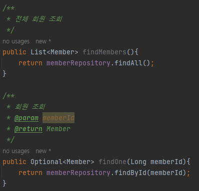 이제 전체 회원을 조회하고, id 값을 이용해 한 명의 회원을 조회하는 서비스 메서드 findMembers(), findOne() 을 다음과 같이 작성해주자.