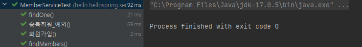 그러나 아래와 같이 중복회원 예외 발생 테스트케이스에서 가입하려는 두 회원의 이름이 "hello" 인 경우라면,