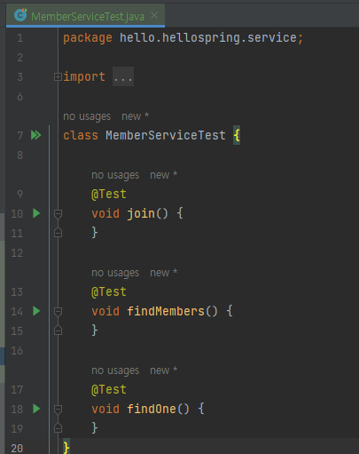 MemberService의 각 메서드에 대한 테스트 코드 메서드가 나타나는 것을 확인할 수 있다.