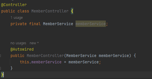 MemberController 클래스의 생성자가 위와 같이 만들어졌으며, 생성자의 파라미터로는 MemberService가 지정되었다.