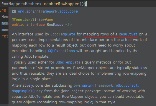 RowMapper 인터페이스의 설명을 확인해보면, 이는 ResultSet의 각 로우 데이터들을 매핑해주는 역할을 한다.