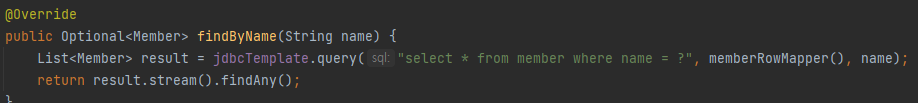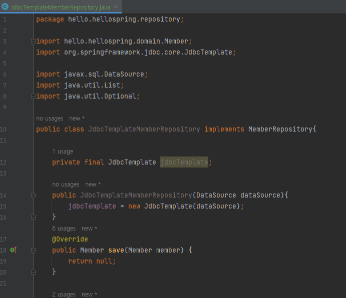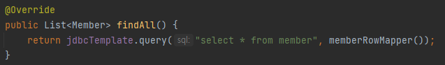 이제 repository의 각 메서드를 JdbcTemplate을 이용해 구현해보도록 하자.