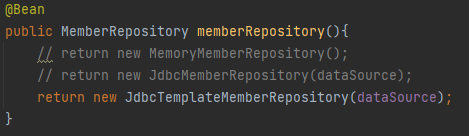 이제 위에서 작성한 JdbcTemplateMemberRepository 를 DB 메모리에 접근하기 위한 레포지터리로 사용하기 위해서는, SpringConfig에서 memberRepository 메서드에서 반환할 타입으로 설정해주면 된다.