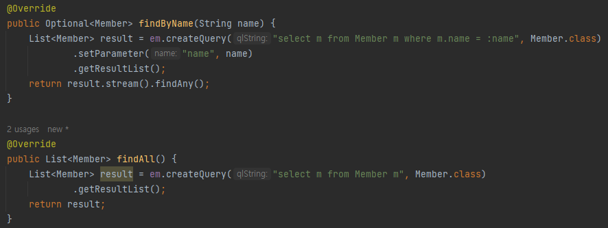 이제 JPA를 사용하는 레포지터리인 JpaMemberRepository 구현체를 다음과 같이 구현해보자.