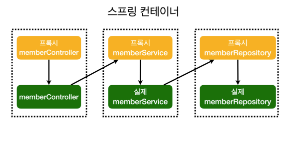 AOP 적용 후 전체적인 구조를 보면, 각 컨트롤러와 서비스, 레포지토리가 모두 프록시를 만들어 작용하게 된다.