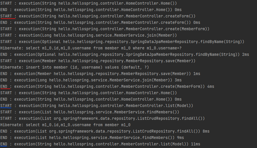 아래에서 빨간색 밑줄은 회원 등록 수행의 시작과 끝을, 파란색 밑줄은 회원 목록 조회의 시작과 끝을 각각 표현한 것이다.
