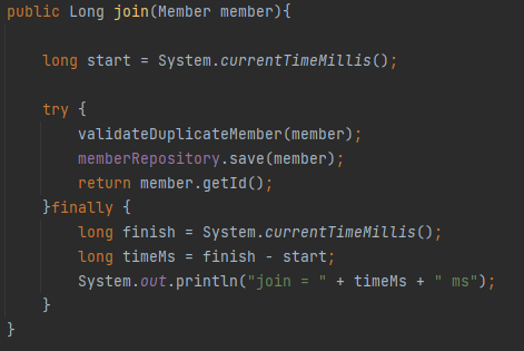 먼저 회원 등록을 수행하는 join() 메서드의 수행 시간을 milli second 단위로 측정하기 위해서는 다음과 같이 코드로 구현해낼 수 있다.