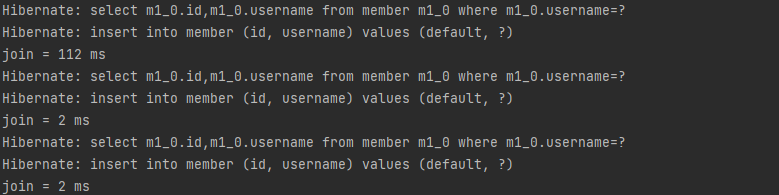 위 메서드를 3번 실행하면 아래와 같이 join = ~ ms 가 콘솔에 출력되는 것을 확인할 수 있다.