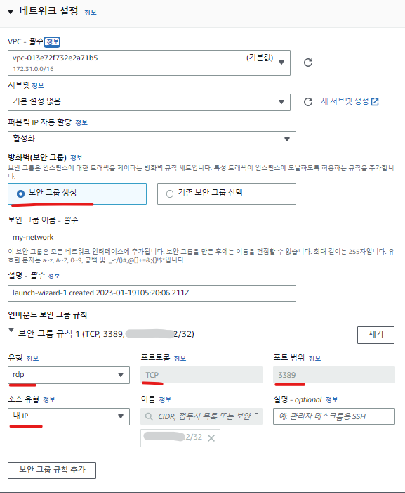 네트워크 설정 으로는 새로운 보안 그룹을 생성하여, 인바운드 그룹 규칙의 유형을 rdp로 설정해준다.