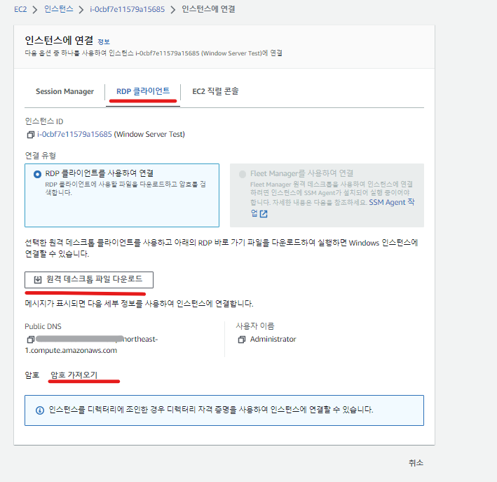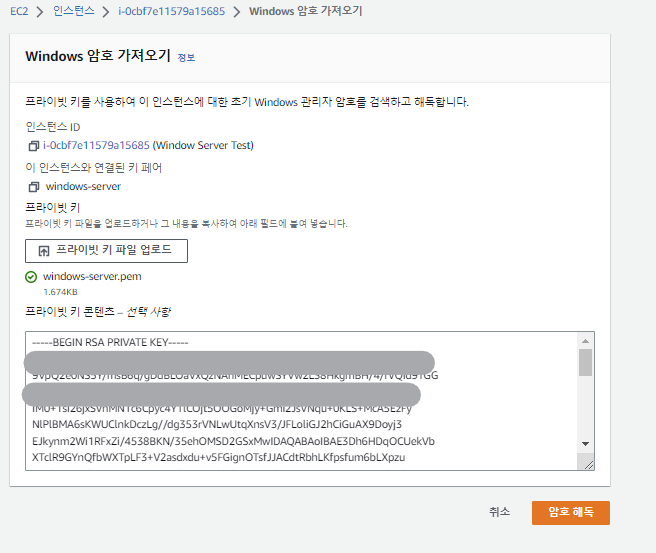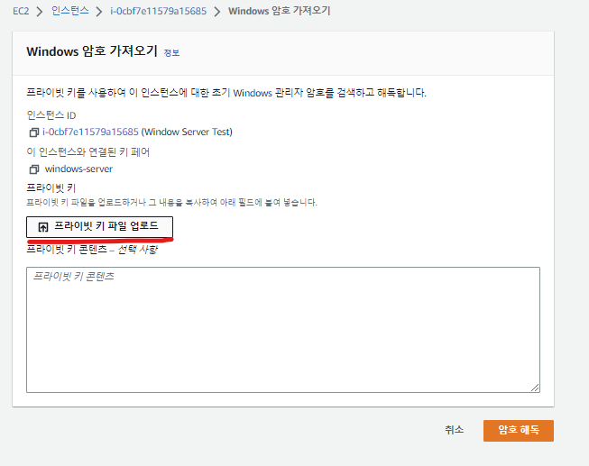 2. 이후 암호 가져오기 를 클릭하여 프라이빗 키 파일 업로드 에 이전에 다운받았었던 .pem 파일을 업로드하자.