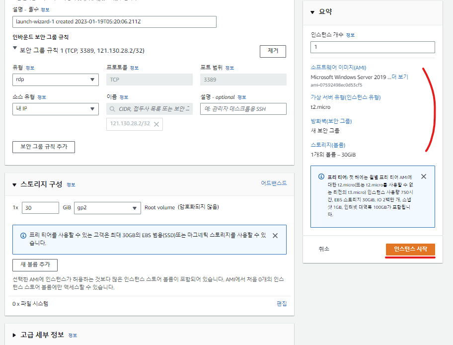 이렇게 생성된 인스턴스의 구성 정보 요약이 나타나고,