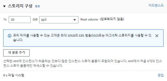스토리지 구성 은 기존에 설정되어 있는 30GB gp2 로 구성한다.