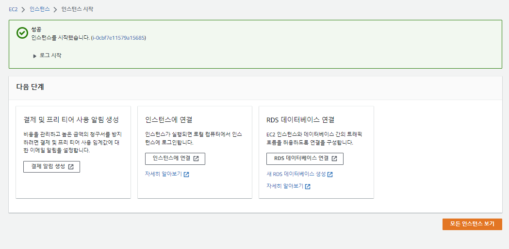 인스턴스 성공 화면이 아래와 같이 나타난다.