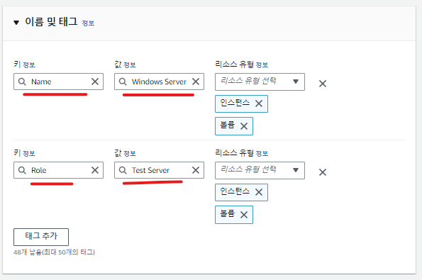 추가 태그 추가를 클릭하여 이름과 태그의 키, 값을 다음과 같이 작성해주자.