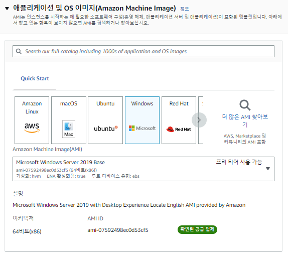 AMI 로는 Windows 를 선택하고, Microsoft Windows Sever 2019 Base (프리티어 사용 가능) 을 선택한다.