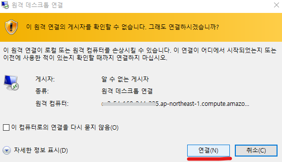 로그인에 성공하게되면, 원격 컴퓨터의 인증서에 있는 이름과, 신뢰를 묻는 주의 창이 뜬다. 예를 클릭하자.