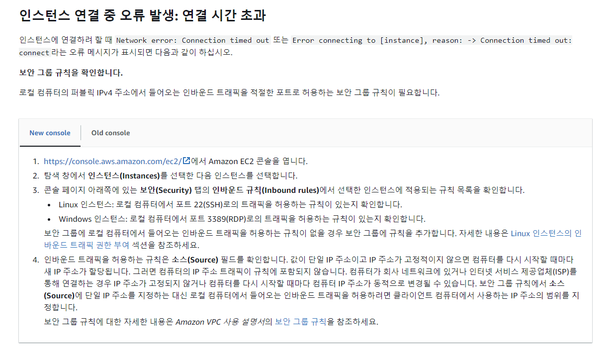 이는 아래 aws docs 에서 보안 인바운드 규칙 설정에 대한 설명이 나타나 있어서 해결할 수 있었다.