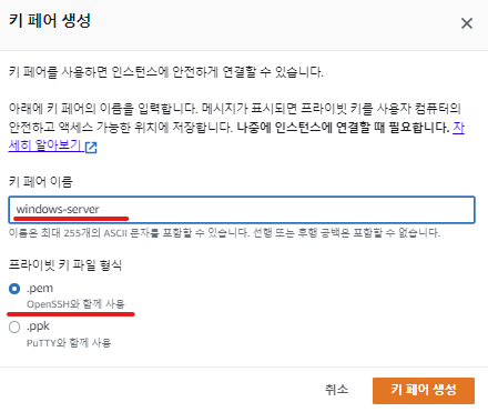 새로운 Key pair 을 생성한다. 키 페어의 이름은 임의로 windows-server 로 지정하고, pem 파일 형식을 선택한다.