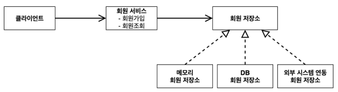 회원 저장소의 역할을 하는 MemberRepository 인터페이스에 대한 구현 클래스는 MemoryMemberRepository, DbMemberRepository, 그리고 외부 시스템 연동 클래스가 있겠다.