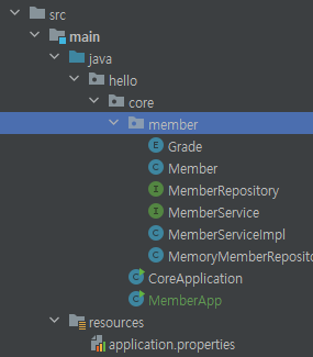 Member 클래스와 Grade Enum, Repository 인터페이스와 메모리 구현체, Service 인터페이스와 구현체,