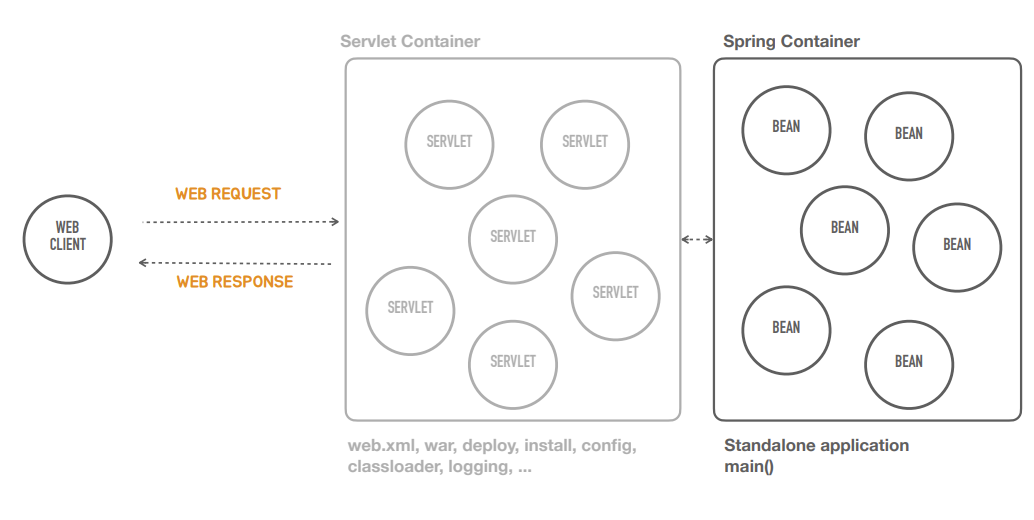 Servlet Container를 사용하기 위해서는 전체적인 컴포넌트들과 라이브러리들의 폴더 구조, war 파일을 이용한 배포 방식과 port 지정, 그리고 classloader, logging과 관련된 많은 설치 및 설정 정보들을 알고 있어야 한다. Servlet Container에 대한 학습 진입 장벽은 매우 높다.
