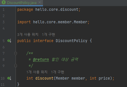우선 할인 정책의 역할을 하는 DiscountPolicy 인터페이스를 다음과 같이 작성하자.