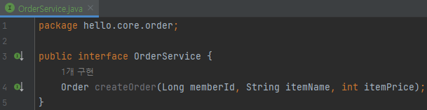 주문 서비스의 역할을 하는 OrderService 인터페이스 내에 주문을 생성하는 createOrder() 메서드의 틀을 다음과 같이 작성하자.
