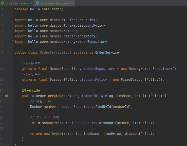 OrderService의 구현체 OrderServiceImpl 클래스는 다음과 같다.