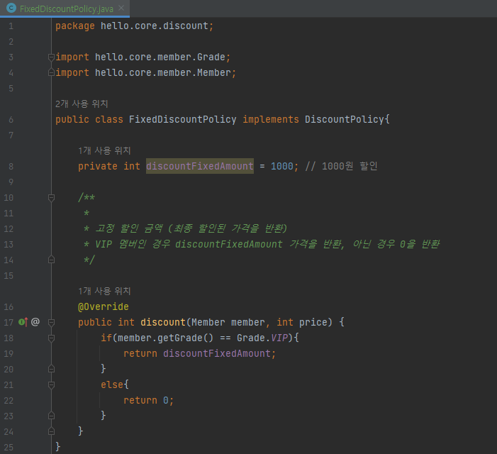 DiscountPolicy의 구현체인, 고정 할인 정책 클래스인 FixedDiscountPolicy 는 다음과 같다.
