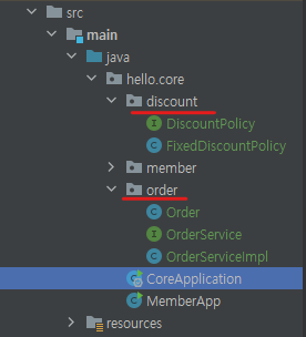 hello.core 패키지 내에 discount, order 이름의 패키지를 다음과 같이 만들고, 순서대로 구현해 나가보도록 하자.