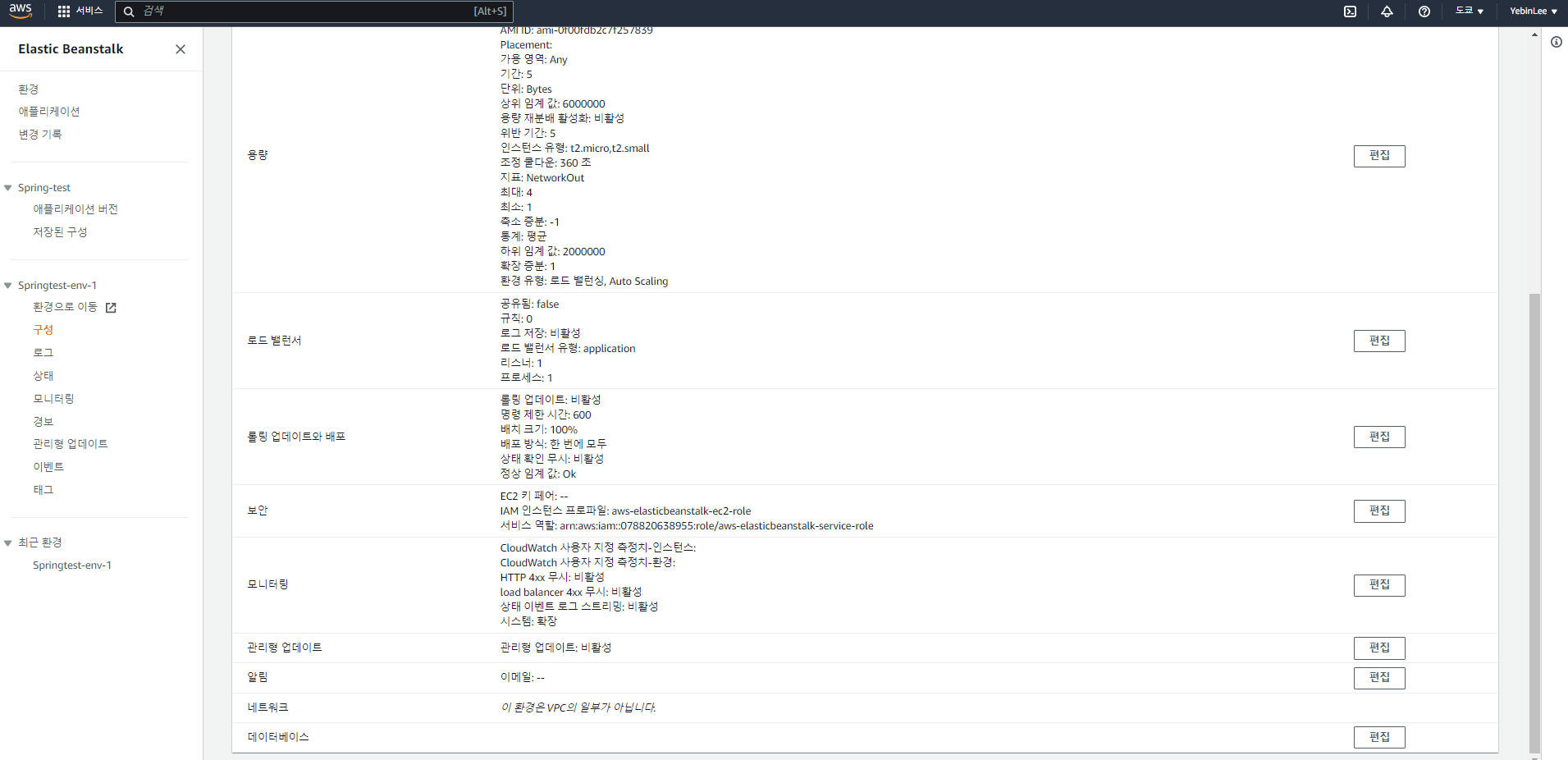 Elastic Beanstalk 환경들에 대한 설정 정보들의 변경 기록 목록을 자세히 확인할 수 있다.