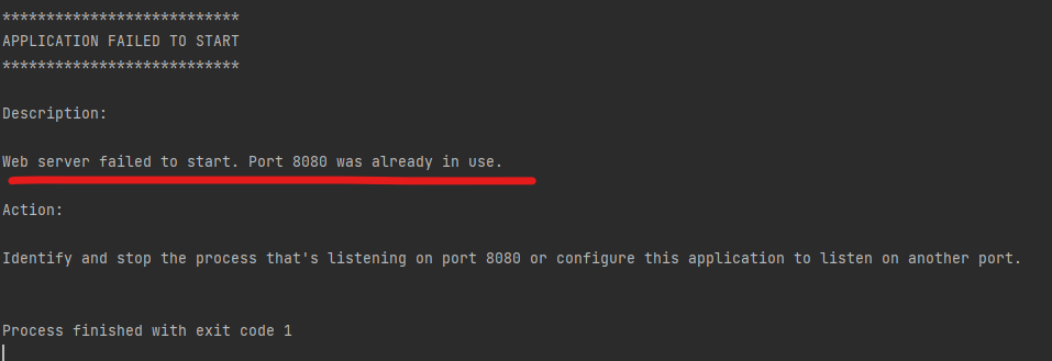 Web server failed to start. Port 8080 was already in use. 라는 설명과 함께 오류가 발생하고 실행 종료가 되었다.