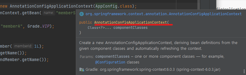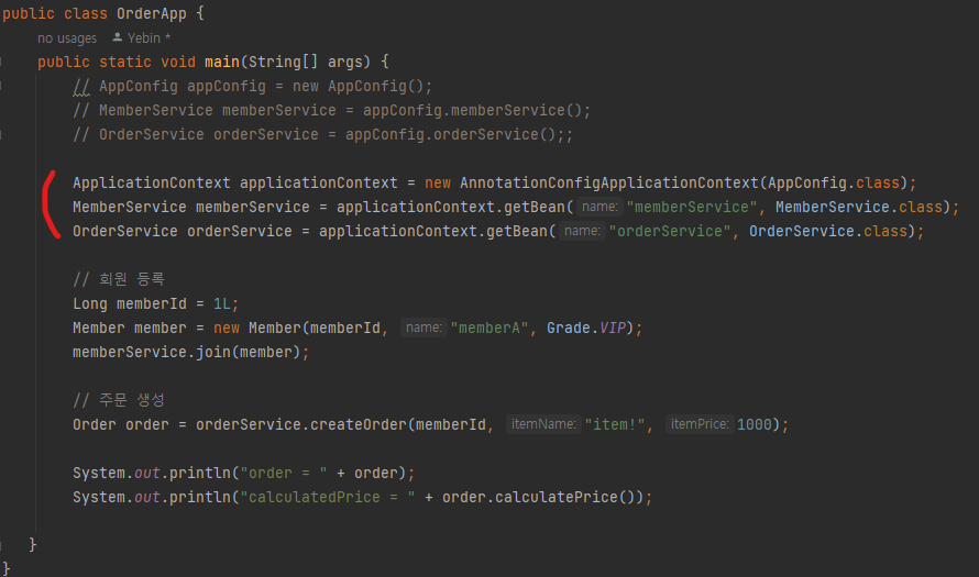 ApplicationContext 인터페이스에, AnnotationConfigApplicationContext 클래스를 통해 @Configuration 어노테이션을 붙여 등록한 AppConfig 설정 클래스 참조 값을 가져오고, getBean() 메서드를 통해 MemberService와 OrderService의 객체를 가져오도록 하자.