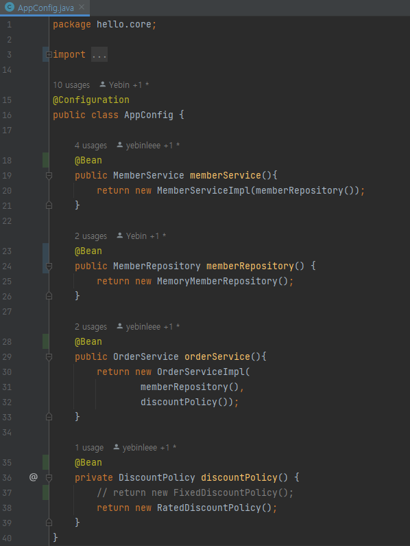 AppConfig 클래스 이름 위에 @Configuration 어노테이션을 추가하여, 설정을 구성하는 Bean 이 존재하는 클래스임을 스프링 컨테이너에게 알리도록 하자.