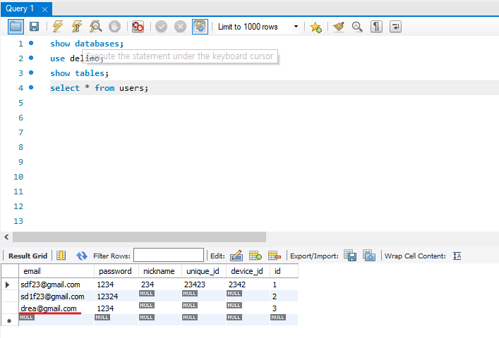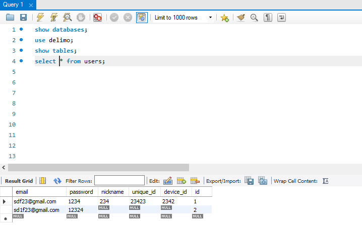 MySQL workbench에서 정상적으로 새로운 유저 값이 insert 되었음을 확인할 수 있다.