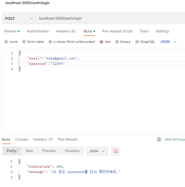 password가 틀린 경우도 테스트가 성공적이다.