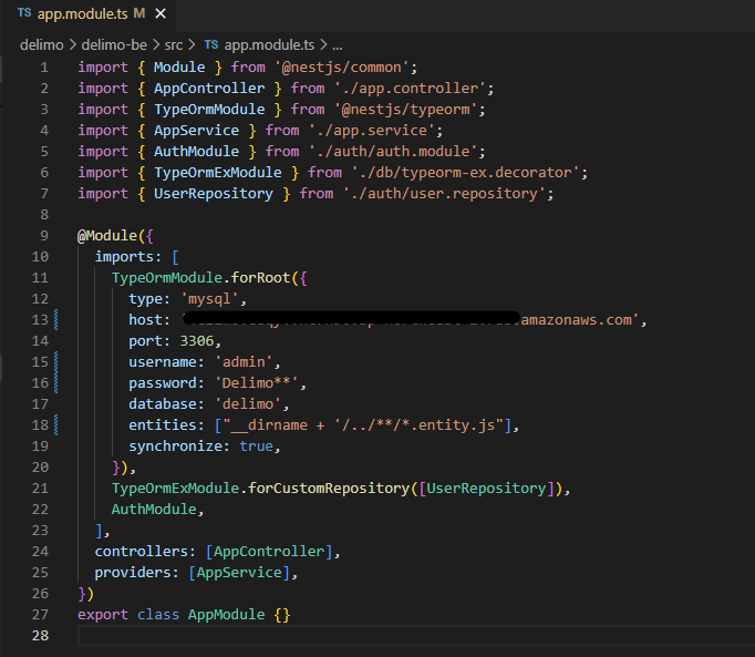 Config 파일을 따로 분리하지 않은 develoption code 레벨에서 TypeOrm 모듈의 DB 정보를 다음과 같이 변경해보자.