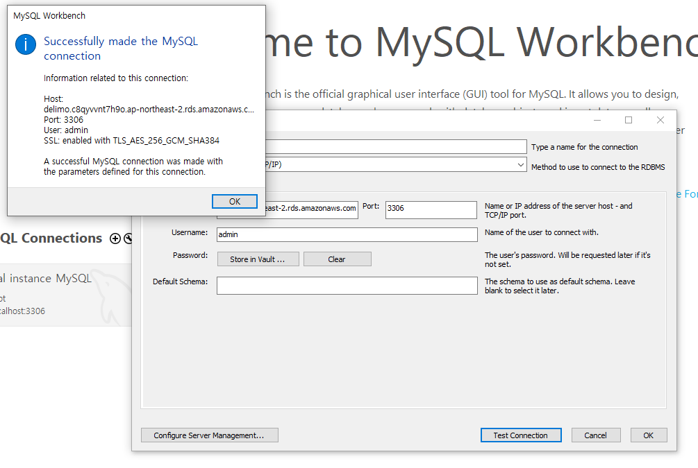 이후 성공적으로 WorkBench와 3306 포트와 RDS MySQL 인스턴스 서버가 연결된 창이 나타난다.