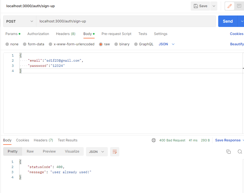 기존에 미리 workbench에서 저장해두었던 email로 회원 가입을 시도했을 때, 400 HTTP 상태 코드와 함께 서버에서 전달하도록 만든 메세지 문구가 성공적으로 뜨는 것을 확인할 수 있었다.