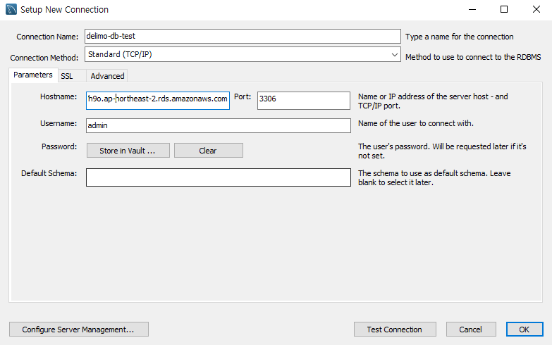 Connection name에는 DB test 를 입력해주었고, Hostname 입력 창에 RDS 인스턴스의 엔드포인트를 복사하여 붙여넣도록 하자.