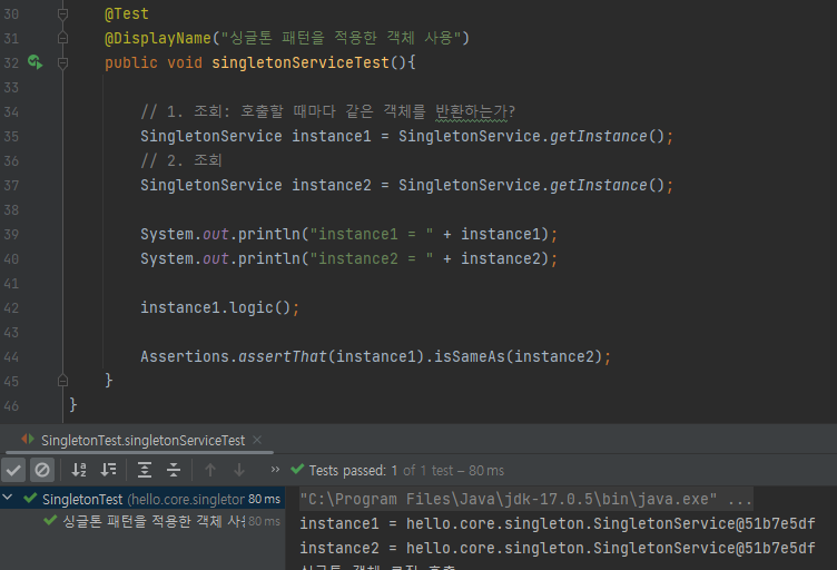 위 SingletonService의 인스턴스를 호출할 때마다 두 객체가 동일한지 아래 테스트를 통해 확인할 수 있다.