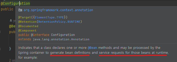 아래 @Configuration의 설명에 나온 바와 같이, @Configuration 어노테이션을 통해 동적으로 컨테이너에 등록되어 있는 빈(@Bean을 통한 등록)인지 아닌지의 여부에 따라 새로 인스턴스를 생성 여부를 결정하게 된다.