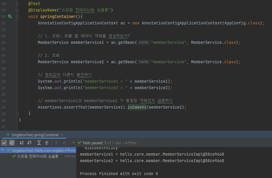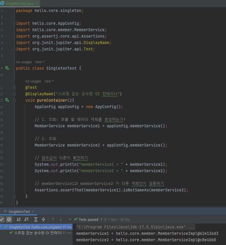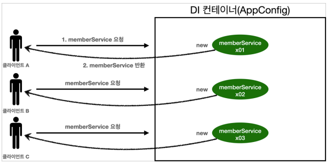 지난번 스프링이 없는 순수한 DI 컨테이너인 AppConfig는 요청을 할 때마다 새로운 객체를 생성한다. 아래의 테스트 코드를 통해 memberService를 호출할 때마다 AppConfig의 memberServiceImpl 구현체 매번 생성하고 있음을 확인할 수 있다.