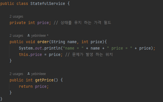 객체 인스턴스를 하나만 생성해서 공유하는 싱글톤 방식은 여러 클라이언트가 하나의 객체 인스턴스를 공유하기 때문에 무상태(stateless)로 설계를 해야 한다.