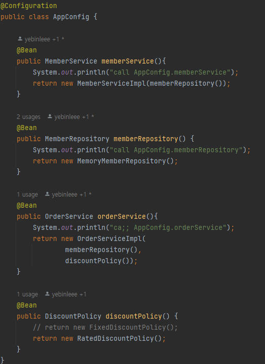 이전에 작성한 AppConfig 구성 정보의 자바 코드를 다시 살펴보면, memberService() 메서드가 총 3번 호출되며 빈 객체가 총 3개 생성되어야 하지만, 실제로는 딱 한 개의 인스턴스만 생성하여 싱글톤을 보장한다.
