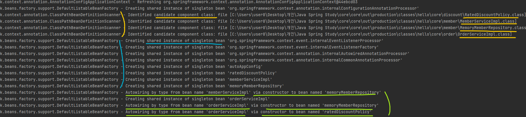 로그를 자세히 확인해보면, 1) 컴포넌트 스캔, 2) 싱글톤 빈 인스턴스 생성, 3) autowiring을 통한 의존 관계 주입의 과정을 모두 확인할 수 있다. 로그 내용은 다음과 같다.